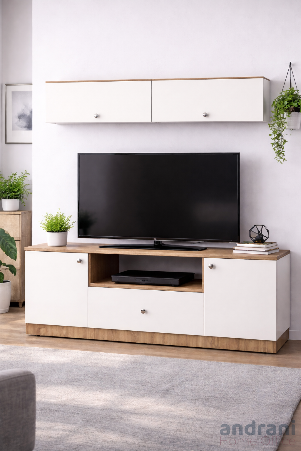 Questo mobile TV combina praticità ed estetica, offrendo uno spazio comodo per il posizionamento del televisore e per la conservazione di vari accessori. Lo spazio contenitore integrato consente di organizzare telecomandi, manuali d’uso, router, cavi e altri oggetti personali, mantenendo tutto ordinato e facilmente accessibile.