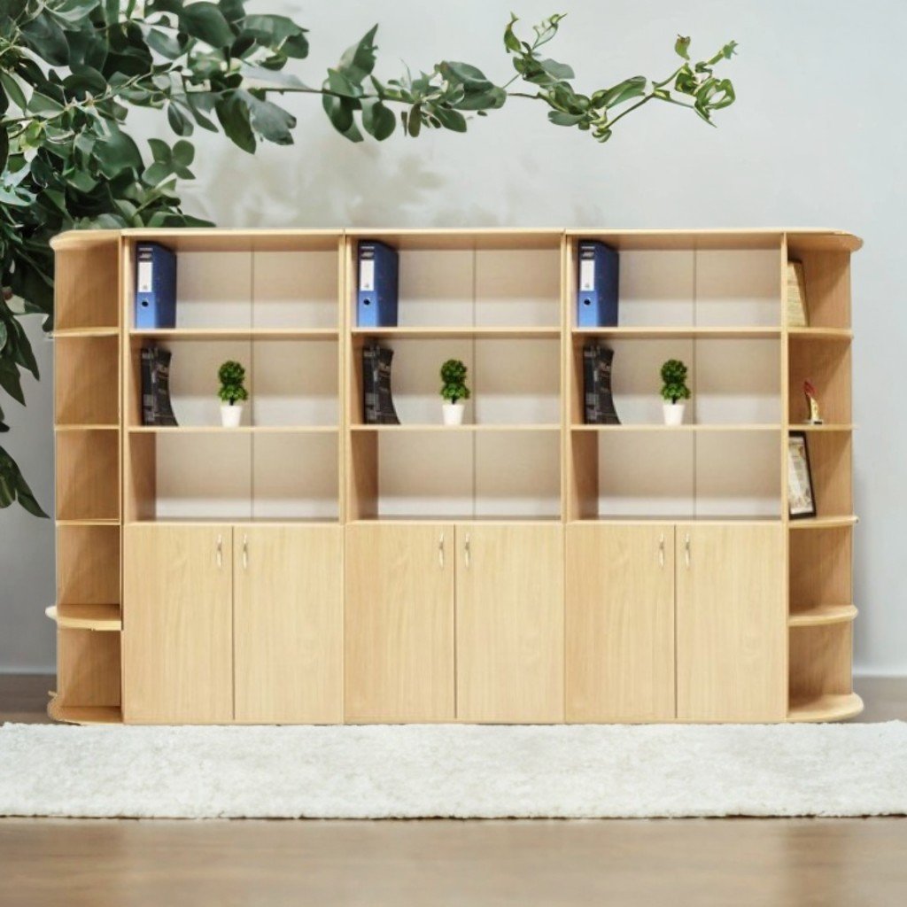 Dimensioni (L×P×A): 3212×403×1816 mm. Set di mobili realizzato in truciolare melaminico con spessore 18 mm. Le facciate sono rifinite con bordi in ABS da 1 mm e le parti interne con bordi da 0,5 mm. Il retro è in melaminico PFL bianco, spessore 3 mm. Il set contiene 5 scomparti: gli scomparti 1 e 5 hanno ciascuno 5 ripiani con angoli arrotondati; gli scomparti 2, 3 e 4 sono dotati di 3 nicchie e 3 ripiani chiusi. I mobili sono dotati di maniglie cromate e piedini regolabili in plastica. I mobili sono fissati tra loro con tasselli in legno. L'assemblaggio viene effettuato con elementi di fissaggio speciali e sicuri. Colori disponibili: faggio, rovere chiaro.