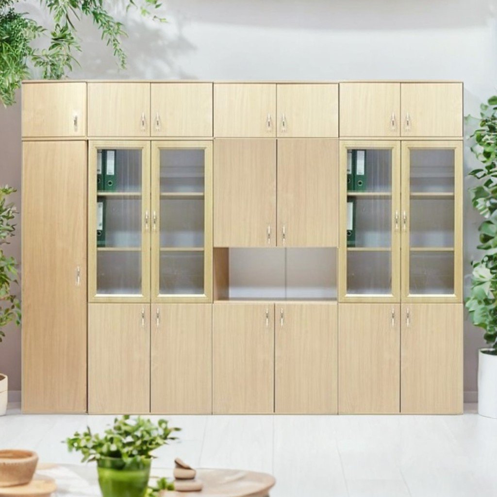 Dimensioni (L×P×A): 2808×403×2186 mm. Set di mobili realizzato in truciolare melaminico da 18 mm di spessore. La facciata è bordata in ABS da 1 mm e le parti interne con bordatura in ABS da 0,5 mm. La parete posteriore è in melaminico PFL bianco da 3 mm di spessore. Il set comprende 4 scomparti: (1) scomparto con un ripiano, barra appendiabiti ovale cromata e pensile; (2 e 4) scomparti con 3 ripiani a vista con ante in vetro, 2 ripiani chiusi e pensile; (3) scomparto a nicchia, 4 ripiani chiusi e pensile. Il set è dotato di maniglie cromate, piedini regolabili in plastica e tutti i pensili sono collegati tra loro con tasselli in legno. Il montaggio avviene con elementi di fissaggio speciali e sicuri. Colori disponibili: faggio, rovere chiaro.