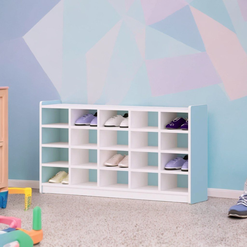 Pratico e resistente scaffale portascarpe, realizzato in truciolare da 18 mm. La struttura comprende 4 livelli con 20 scomparti aperti, ideale per l'utilizzo in spazi educativi o collettivi. Tutti i componenti sono uniti con ferramenta speciale e sicura. Lo scaffale è dotato di gambe in plastica resistente. Dimensioni: 1200 x 250 x 650 mm Colori disponibili: bianco/giallo, bianco/blu Garanzia: 24 mesi