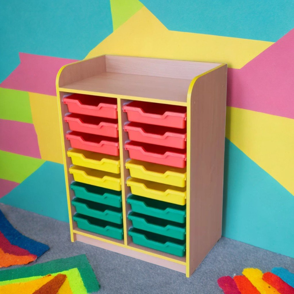 Dimensioni (LxPxA): 696 x 410 x 937 mm Peso: 21,50 kg Mobile realizzato in truciolare melaminico da 16 mm, con retro in melaminico PFL bianco da 3 mm. La facciata è rifinita con bordo in ABS giallo da 1 mm. Include 16 contenitori in plastica nei colori giallo, rosso e verde, più un ripiano superiore per ulteriore spazio di archiviazione. Montaggio sicuro con elementi speciali, fissaggio a parete per la sicurezza dei bambini. Guarnizioni in plastica resistenti. Colori della struttura: faggio, rovere chiaro Contenitori inclusi nel prezzo