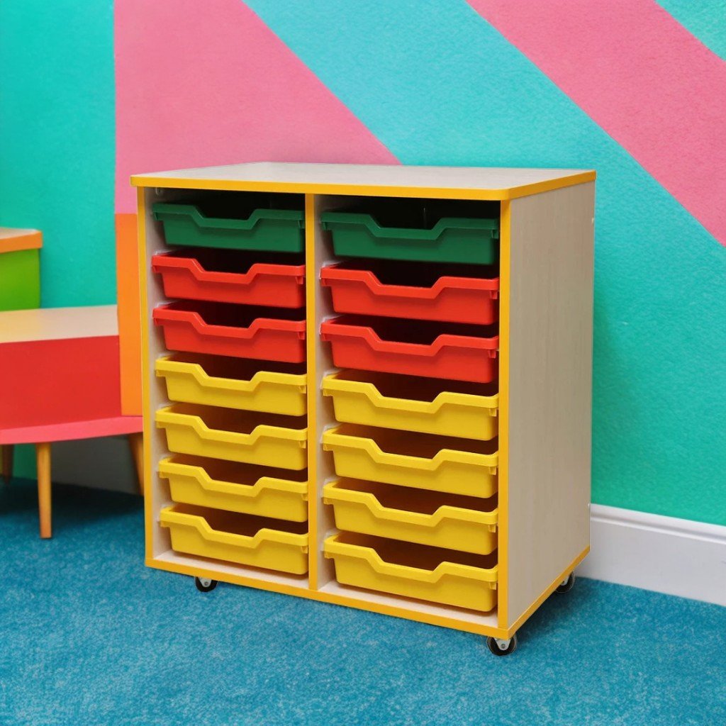 Dimensioni (LxPxA): 699 x 440 x 750 mm Peso: 21,80 kg Armadio per bambini, realizzato in truciolare melaminico da 16 mm, con retro in melaminico PFL bianco da 3 mm. La facciata è protetta da un bordo in ABS giallo da 1 mm. Include 14 contenitori in plastica nei colori giallo, rosso e verde, di varie dimensioni, e un ripiano superiore. Perfetto per organizzare giocattoli o materiale didattico. Fissaggio sicuro a parete e montaggio con elementi speciali. Guarnizioni in plastica resistenti. Colori della struttura: faggio, rovere chiaro Colori dei contenitori: giallo, rosso, verde