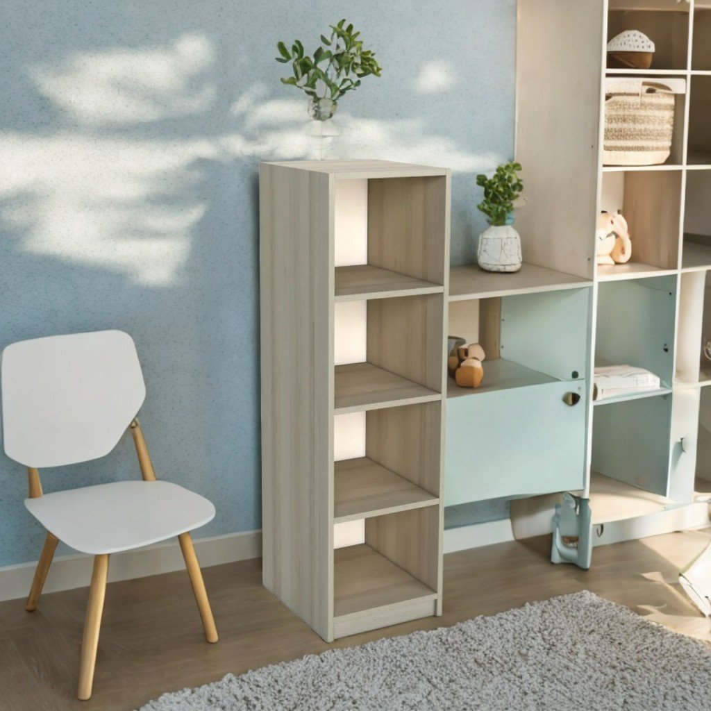 Questo mobiletto da 360x400x1400 mm è realizzato in truciolare laminato da 18 mm di spessore e il retro è in MDF laminato bianco, offrendo un aspetto pulito e moderno. Dispone di quattro ripiani aperti, ideali per organizzare e accedere rapidamente al contenuto. I componenti sono assemblati con elementi di sicurezza e il corpo del mobiletto è rifinito nell'elegante tonalità di faggio artigianale perlato.