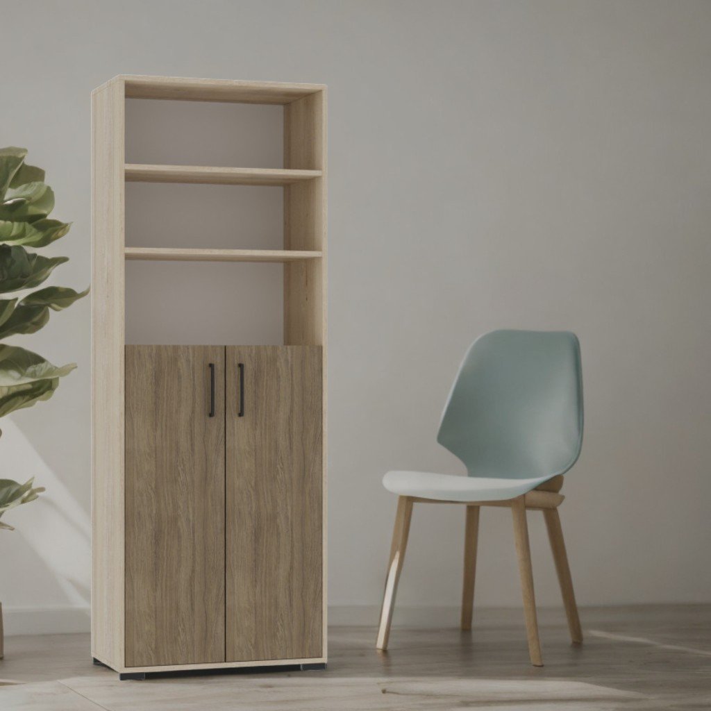Dimensioni (L×P×A): 719×405×2025 mm. Il mobile è realizzato in truciolare laminato con uno spessore di 18 mm. La facciata è protetta da un bordo in ABS da 1 mm e le parti interne sono dotate di un bordo da 0,5 mm. Il retro del mobile è realizzato in melaminico PFL bianco, spessore 3 mm. La configurazione prevede ripiani aperti nella parte superiore e ripiani chiusi nella parte inferiore, alcuni dei quali regolabili in altezza. Gli elementi sono uniti con accessori di fissaggio sicuri e consentono il fissaggio del mobile alla parete. La base del mobile è dotata di piedini in plastica. Colori disponibili: perla artigianale, rovere urbano marrone.