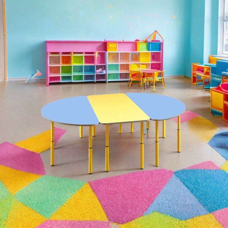Set tavolo composto da 3 sezioni, ideale per gruppi fino a 8 bambini. Il piano del tavolo è realizzato in truciolare melaminico colorato da 16 mm con angoli arrotondati e bordo in ABS argento. La struttura in metallo con profilo arrotondato è regolabile in altezza su tre livelli (460 / 520 / 580 mm) tramite un sistema telescopico con guarnizioni di protezione. Le gambe sono verniciate elettrostaticamente e dotate di tappi in plastica.
