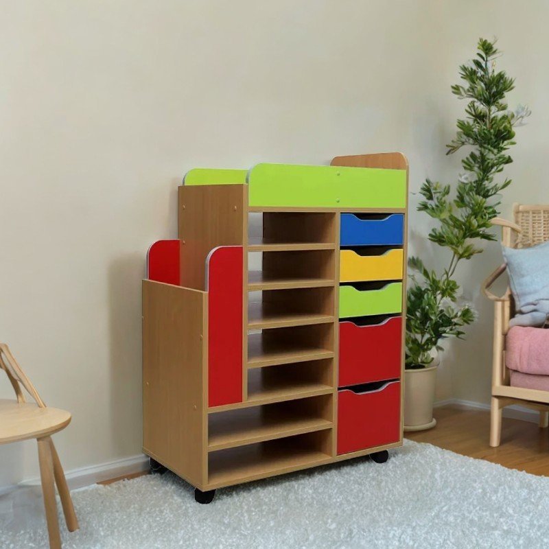 Dimensioni (LxPxA): 50 x 1010 x 400 mm Peso: 46,4 kg Ripiano in truciolare melaminico da 16 mm, con retro in melaminico PFL bianco da 3 mm. I frontali dei mobili sono rifiniti con bordi in ABS da 1 mm e i frontali dei cassetti con bordi in ABS da 0,5 mm color faggio. Include 7 ripiani aperti e 5 cassetti con intagli ergonomici e angoli arrotondati per la sicurezza. Montato su 4 ruote piroettanti per una facile movimentazione. Assemblaggio realizzato con speciali e sicuri fissaggi. Colore struttura: rovere chiaro Colori dei componenti: giallo, verde lime, rosso, blu