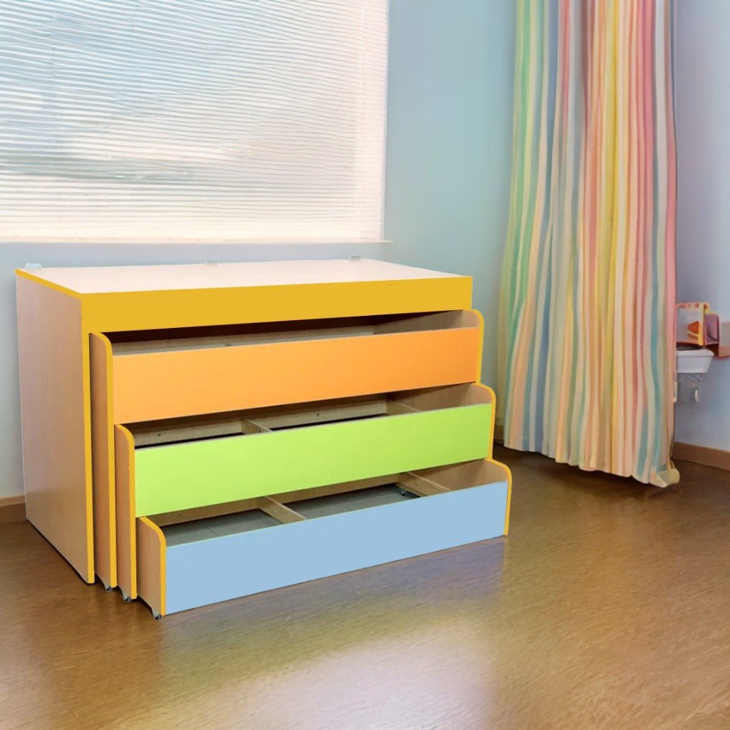 Letto per bambini a tre livelli e ripiano multifunzionale, con dimensioni di 1552 x 682 x 950 mm e un peso di 106 kg. La larghezza del letto in modalità estensibile raggiunge i 2522 mm. Il letto è dotato di tre piani mobili e di un ripiano fisso superiore, il tutto montato su quattro ruote piroettanti per una facile movimentazione. Il piano di appoggio del materasso è realizzato in multistrato di 10 mm di spessore con fori per la ventilazione, mentre il piano superiore è in multistrato di 12 mm. La struttura del letto è realizzata in truciolare melaminico di 16 mm di spessore, con bordi in ABS da 1 mm. I bordi di ogni ripiano sono arrotondati e lisci e la parte inferiore del telaio è dotata di guarnizioni in plastica resistente. Tutti i componenti sono assemblati con elementi di fissaggio nascosti e sicuri. Il colore del telaio è disponibile in faggio e rovere chiaro, mentre la parte anteriore è colorata in rosso, arancione, verde lime e azzurro. Il prodotto viene venduto senza materasso e ha una garanzia di 24 mesi.