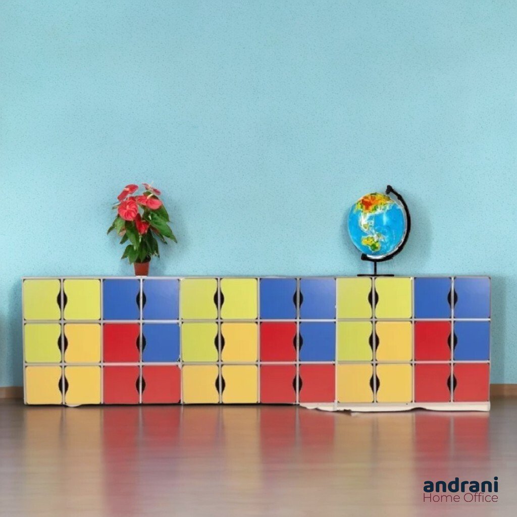 Dimensioni (LxPxA): 3888 x 350 x 1040 mm Peso: 171 kg Il set è realizzato in truciolare melaminico da 16 mm, con la parete posteriore in melaminico PFL bianco da 3 mm. Le facciate e gli elementi interni sono rifiniti con bordi in ABS argento (1 mm e 0,5 mm). Include 36 ripiani con ante colorate con angoli arrotondati e speciali aperture per l'apertura. Il mobile è assemblato con elementi di fissaggio sicuri e può essere fissato alla parete per la sicurezza dei bambini. Dotato di guarnizioni in plastica resistenti. Colori: giallo, verde lime, rosso, blu, beige