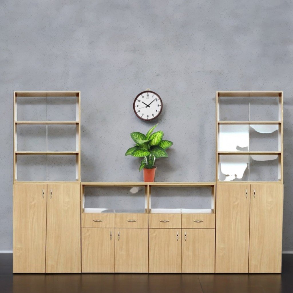 Dimensioni (L×P×A): 3200×400×2200 mm. Set di mobili realizzato in truciolare melaminico da 18 mm di spessore. La facciata è rifinita con bordo in ABS da 1 mm e le parti interne con bordo in ABS da 0,5 mm. Il retro è in melaminico PFL bianco, spessore 3 mm. Il set contiene 4 scomparti: gli scomparti 1 e 4 hanno ciascuno 3 nicchie e 3 ripiani chiusi; gli scomparti 2 e 3 hanno ciascuno una nicchia, 2 cassetti e 2 ripiani chiusi. I mobili sono uniti con tasselli in legno e hanno maniglie cromate. Tutti i componenti sono assemblati con elementi di fissaggio speciali e sicuri. Il set è dotato di piedini regolabili in plastica. Colori: faggio, rovere chiaro.
