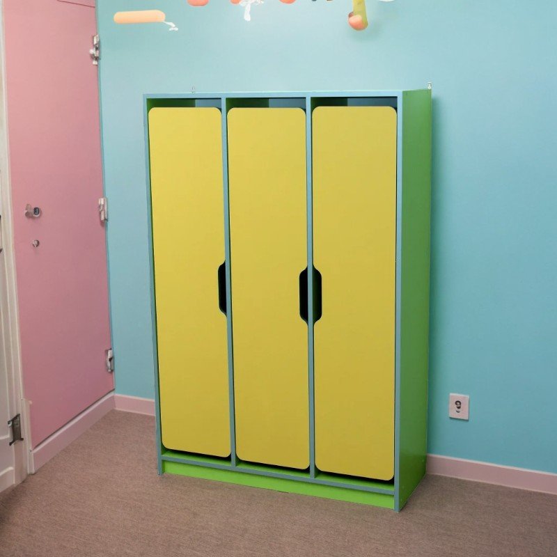 Il modello è dotato di 3 ante decorative con angoli arrotondati e sistema di apertura ergonomico. Ogni vano include due ripiani (superiore e inferiore) e due appendiabiti cromati.