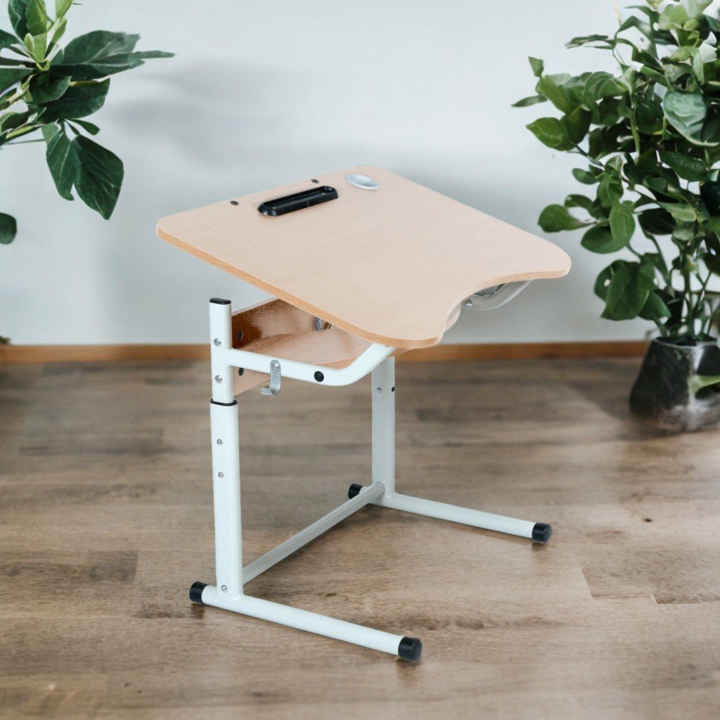 Banco scolastico individuale antiscoliosi, regolabile (gr. 3–6), con ripiano e telaio ovale. Dimensioni: 700x500 mm. Peso: 10,6 kg. Altezza regolabile: 580/640/700/760 mm. Piano pieghevole con angolo di inclinazione: 0°–16°. Pannello truciolare melaminico ergonomico da 16 mm con bordo in ABS da 1 mm. Frontale e ripiano in truciolare da 16 mm e 0,5 mm. Dotazioni: portalibri, bicchiere, portapenne, gancio porta cartella. Telaio metallico rotondo (Ø25/32 mm, spessore 1,2 mm), snodo telescopico con guarnizioni di protezione. Verniciatura elettrostatica e polimerizzazione. Colore piano: faggio, rovere chiaro, giallo/lime, sakura/lavanda. Colore telaio: verde, giallo, grigio, grigio grafite.