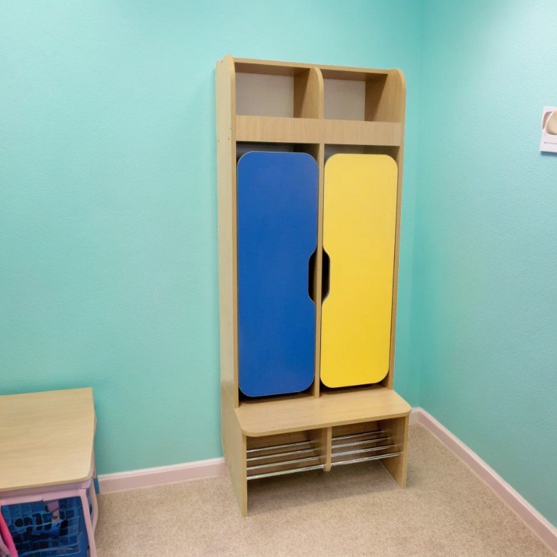 La struttura ha una finitura in faggio, disponibile in allegre combinazioni di colori: faggio/verde lime/giallo, faggio/blu/giallo, faggio/arancione/rosso.