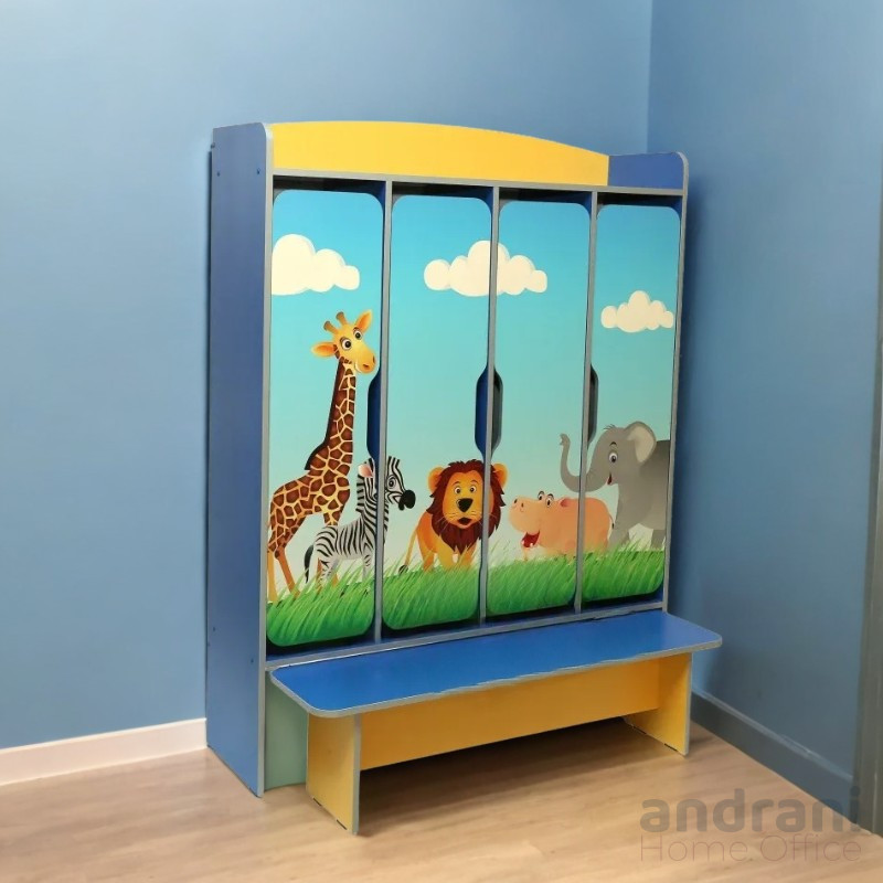 Questo modello di spogliatoio è realizzato in truciolare melaminico da 16 mm con retro in PFL bianco da 3 mm e ha una struttura robusta, ideale per spazi educativi. Le facciate sono rifinite con bordi in ABS da 1 mm e gli elementi interni con bordi da 0,5 mm, entrambi in colore argento. Le quattro ante arrotondate sono decorate con immagini safari resistenti all'acqua e dotate di apertura ergonomica. Ogni vano include due ripiani (superiore e inferiore) e due grucce cromate. La panca estensibile integrata ha angoli arrotondati per la sicurezza. Il mobile si fissa alla parete ed è dotato di guarnizioni in plastica resistenti e di elementi di fissaggio sicuri. La struttura è disponibile nella combinazione blu/giallo e le facciate sono colorate con stampa fotografica. Dimensioni: 1240 x 350 x 1610 mm | Peso: 71 kg | Garanzia: 24 mesi