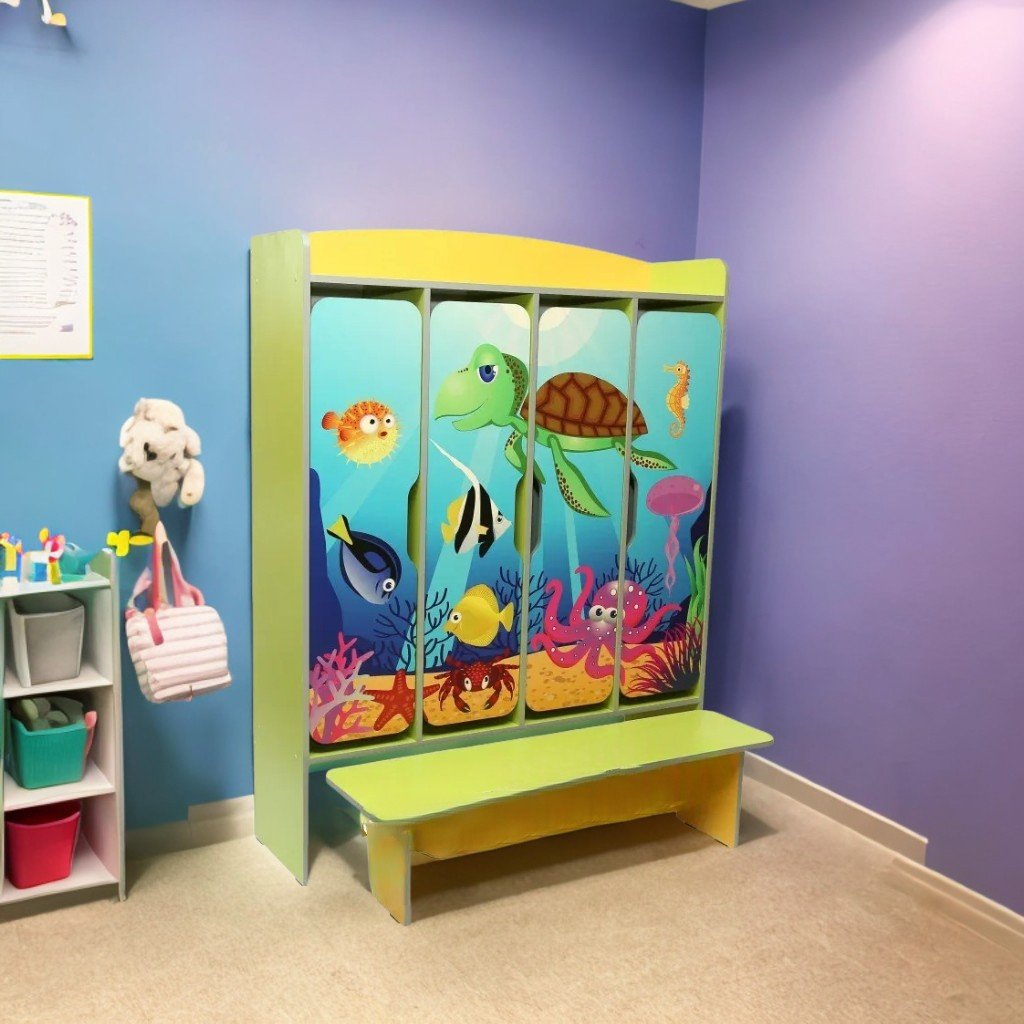 Spogliatoio pratico e sicuro, ideale per asili o spazi educativi, realizzato in truciolare melaminico da 16 mm, con retro in melaminico PFL da 3 mm. La facciata è rifinita con bordo in ABS argento da 1 mm e l'interno con bordo in ABS da 0,5 mm, entrambi in tonalità argento. Le ante con angoli arrotondati sono decorate con stampa fotografica a tema - animali marini, resistenti all'acqua. Ogni scomparto include due ripiani (superiore e inferiore) e due grucce cromate. Il mobile è dotato di una panca estensibile con angoli arrotondati per comfort e sicurezza.