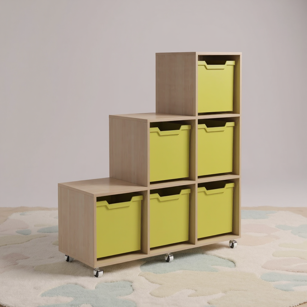 Dimensioni (LxPxA): 1200 x 400 x 900 mm Il ripiano è realizzato in truciolare melaminico da 16 mm, con bordi rifiniti con nastro in PVC da 1 mm. Include 7 vassoi in plastica, perfetti per riporre giocattoli per bambini, materiale didattico, libri e oggetti personali. Montaggio sicuro con accessori speciali. Dotato di 6 ruote piroettanti per una facile movimentazione. Colori disponibili: rovere latte, faggio, lavanda, lime, arancione, crema, blu navy, giallo