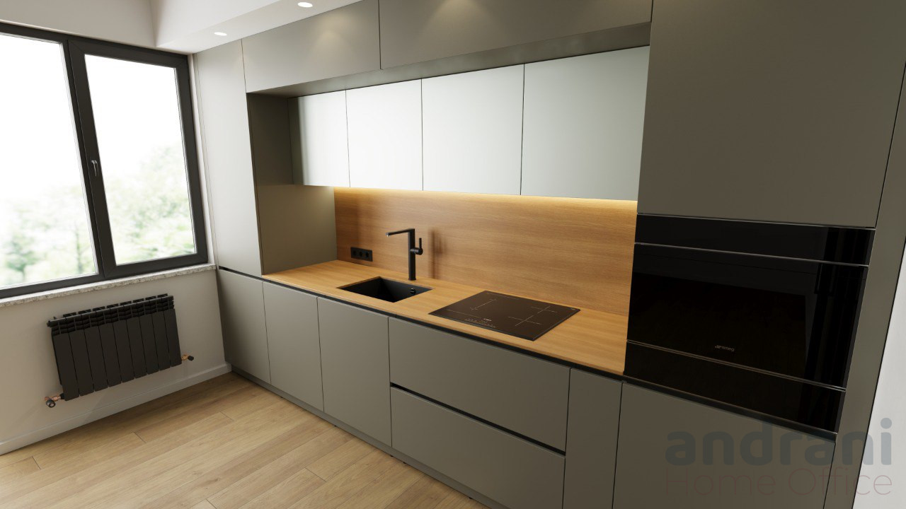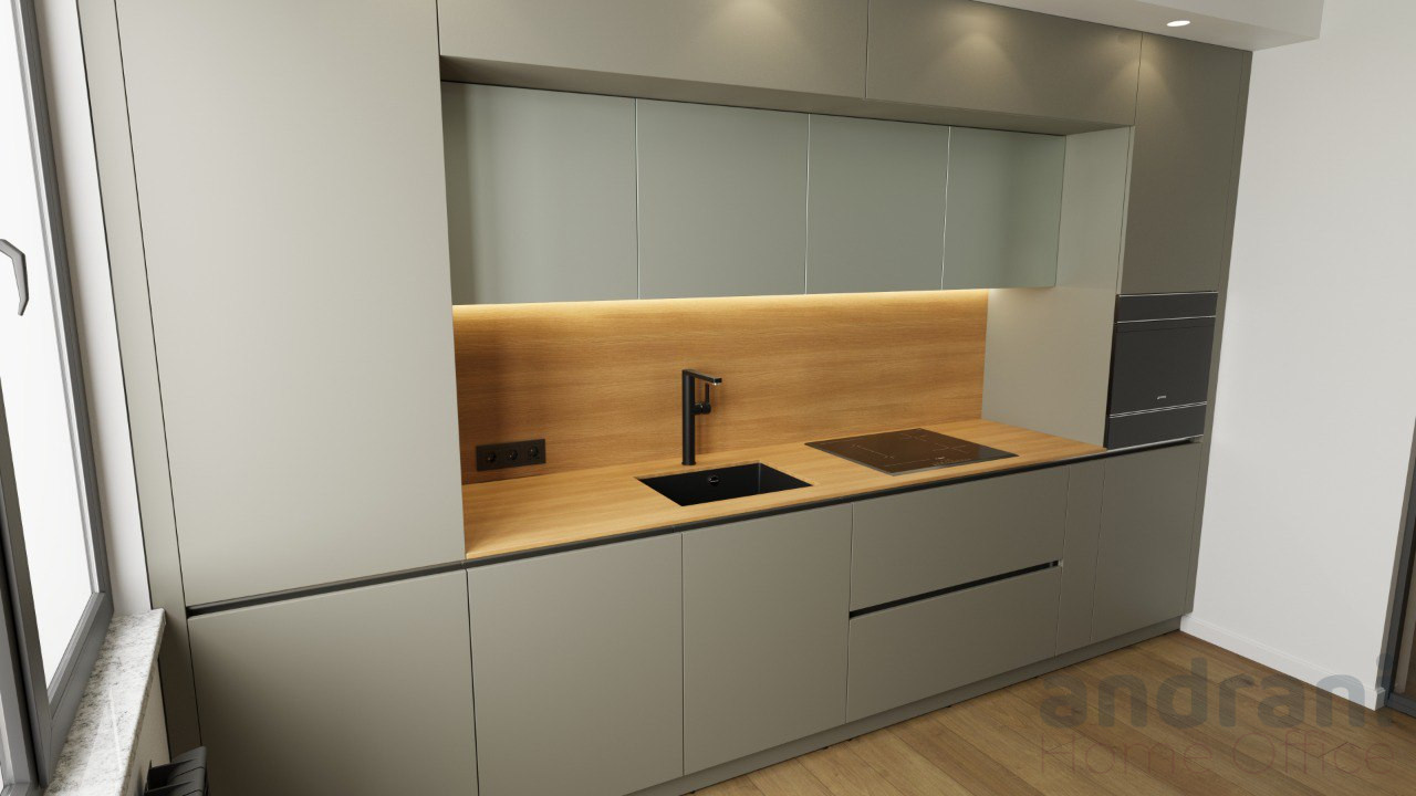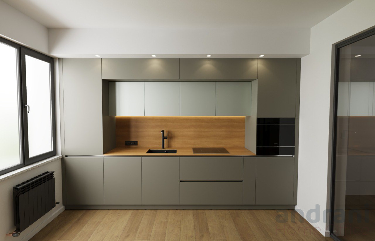 La combinazione di tonalità grigie opache, accenti Spectrum e geometrie minimaliste crea un’estetica contemporanea e sofisticata, facilmente integrabile in qualsiasi ambiente. È una cucina spaziosa, armoniosa e pratica, che unisce design premium e durabilità nel tempo.